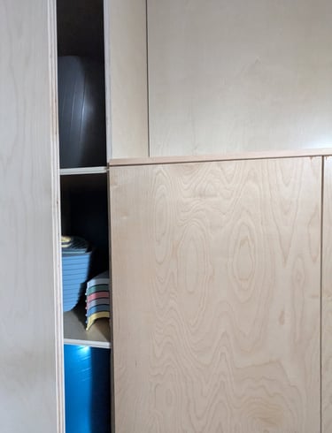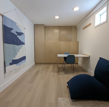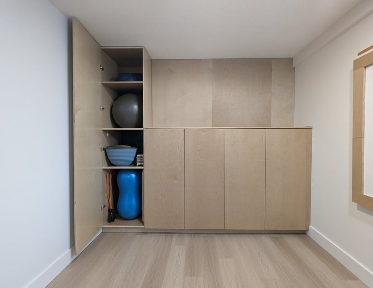 One of the first priorities was creating storage that kept the therapy supplies organized and out of sight. We had to get creative here as there were electrical panels that couldn't be blocked. The solution was a sleek, built-in cabinet crafted from durable, finished plywood. We opted for a push-lock mechanism for a clean look — and to make it more challenging for curious little hands to open! Custom shelves were measured to fit larger tools like a peanut therapy ball and storage containers, ensuring every item had its place.