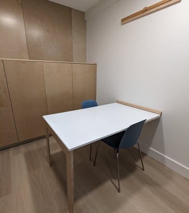 Next, they needed a space-saving solution for table activities. We designed a modern, fold-down table that blends seamlessly into the clinic's environment. When folded up, it doubles as a wall-mounted frame, and when folded down, it becomes a spacious, work surface. The whiteboard tabletop adds an extra layer of versatility, allowing kids and therapists to write directly on it.