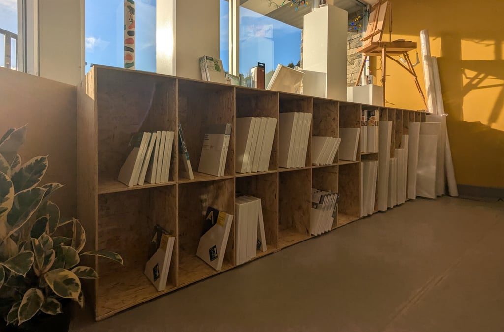 When Kate reached out to us for custom shelving, she had a clear vision: a well-organized space where customers could easily find what they were looking for. We carefully designed and built shelving to accommodate a variety of canvas sizes.
